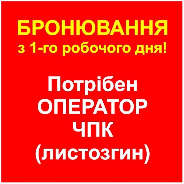 ОПЕРАТОРА ЧПК (листозгин), з досвідом роботи. Оплата 120 грн./година.