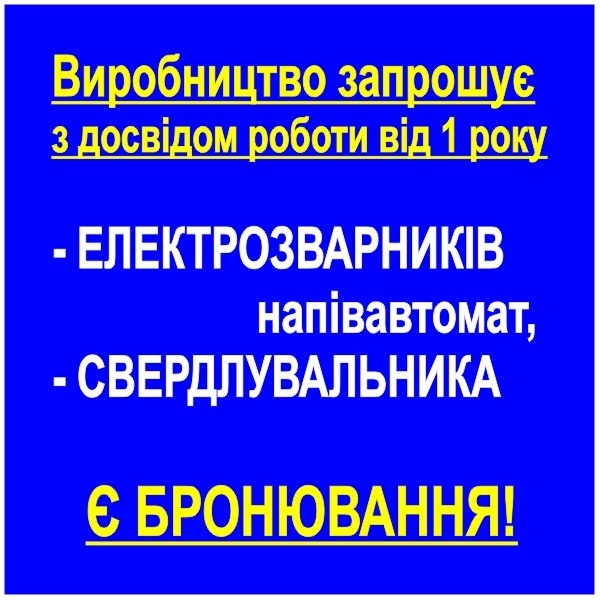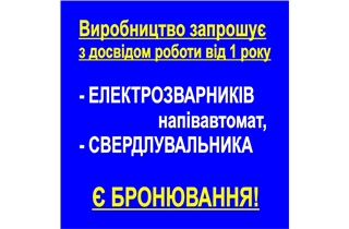 ЕЛЕКТРОЗВАРНИКІВ напівавтомат. Досвід від роботи від 1 року. Погодинна оплата + виробіток, з/п 25000-45000 грн./місяць на руки.