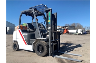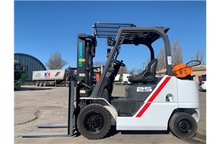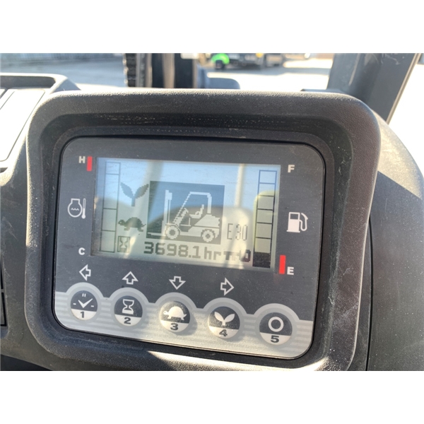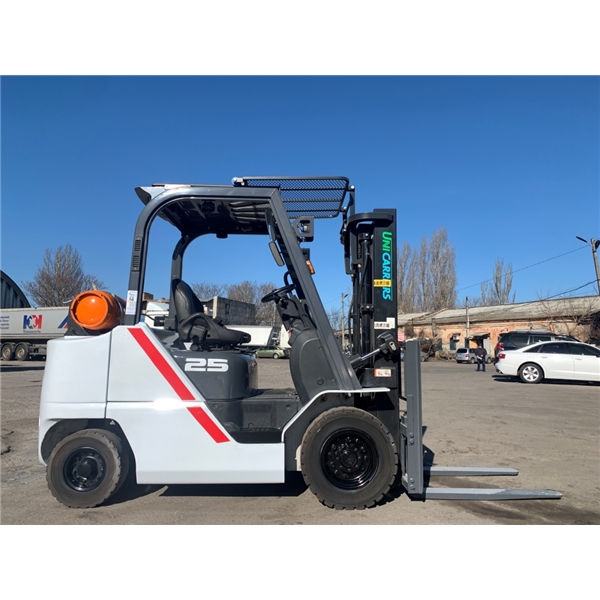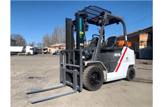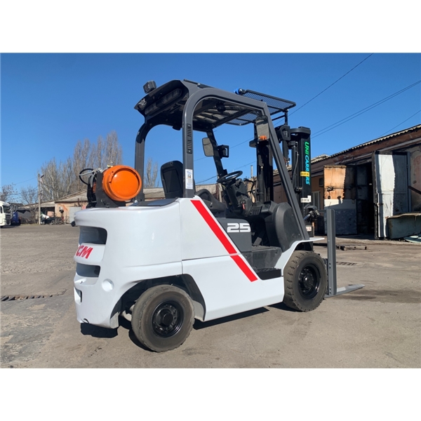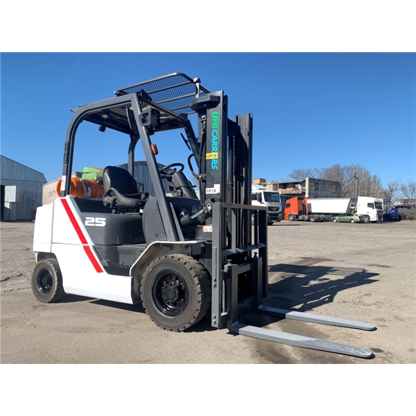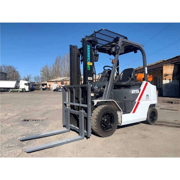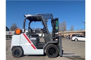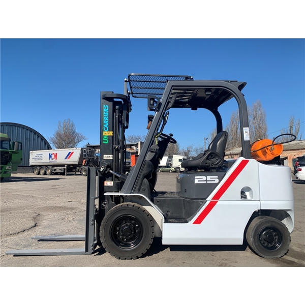 Модель: FHGE25T5. Номiнальна вантажопідйомність 2.5 тонни. Максимальна висота підйому вантажу 3 метри. Щогла двохсекційна (duplex) яка не втрачає вантажопідйомності при висоті підйому. Двигун газ-бензиновий, з заводським газовим обладнанням, завдяки чому автонавантажувач у теплу пору року можє запускатись вiдразу на газу, без прогріву системи на бензині. 2018 рiк (напрацювання 3697 мотогодин). Меню перекладено англійською мовою для зручності. Коробка перемикання передач надiйна i найпоширенiша на данний час - гiдромеханiка (автоматична із гідротрансформатором). Обладнаний найсучаснішим двигуном, економічним інжекторним Nissan GK25. 4-циліндровий, робочим об'ємом 2.5 літра і потужністю 54 к. с. який славиться своєю надійністю і невибагливістю і без змін встановлюється на автонавантажувачах по сьогоднішній день і головне ремонтопридатний. Колеса 12 діаметра на ведучiй осі, що покращує прохідність