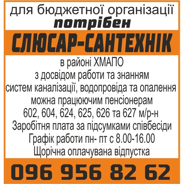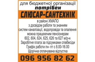 Для бюджетної організації на постійну работу в районі ХМАПО потрібен Слюсар-сантехнік з досвідом работи та знанням систем каналізації, водопровіда та опалення, можна працюючим пенсіонерам 602, 604, 624, 625, 626 та 627 м/р-н.