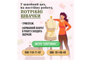 У швейний цех, на постійну роботу, потрібні Швачки. Трикотаж. Карманний апарат в роботу входить зборкой та отделочні строчки, всі операції винесені окремо.